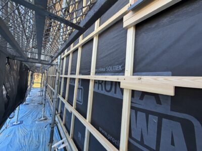 そして木が縦と横に交差してますがこれが外壁の下地兼空気層なんです。