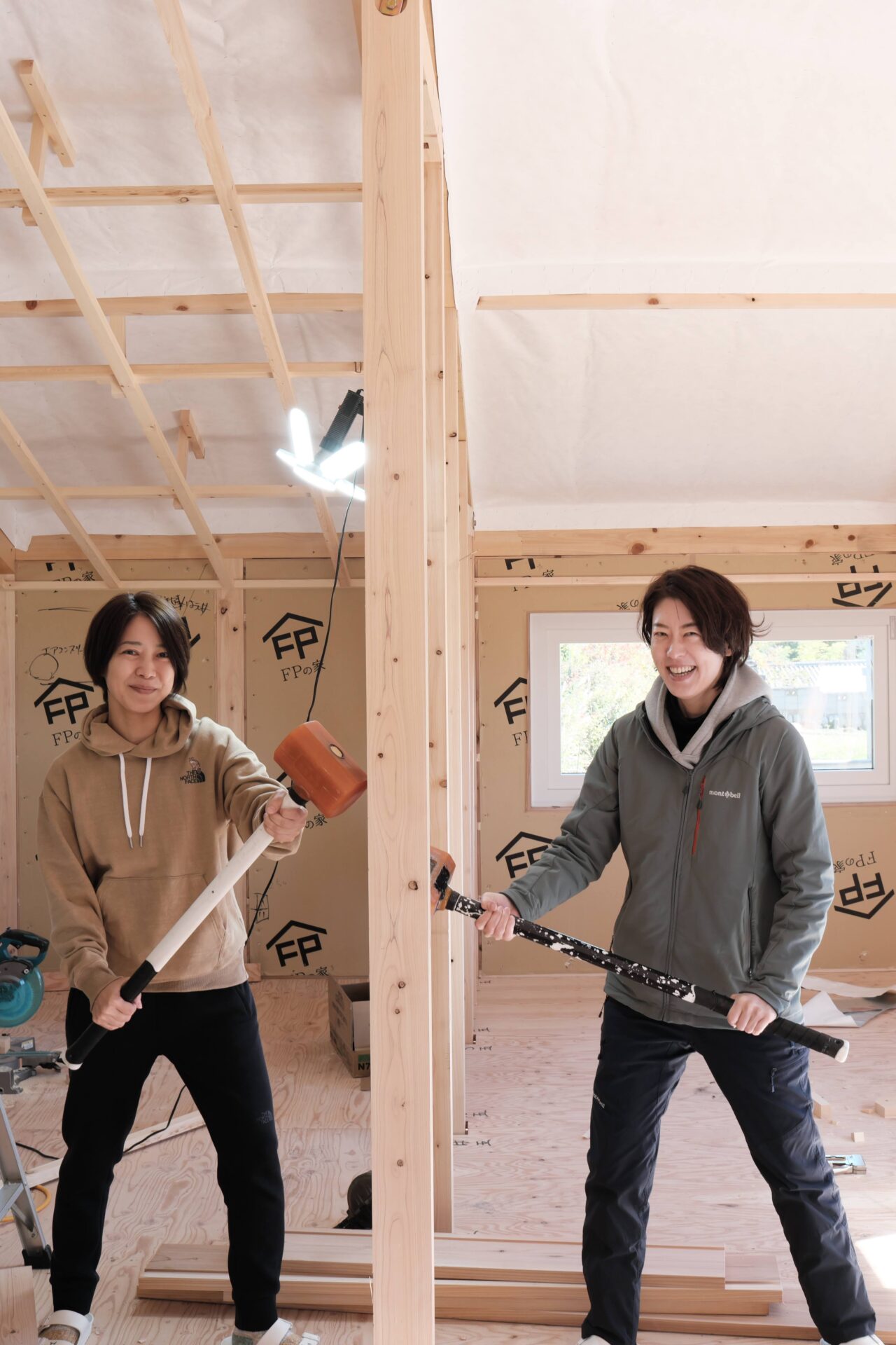 棟持ち柱を棟梁とお施主が槌(でっかいハンマー)で叩き締めるってことですね。