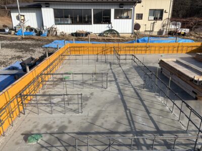 コンクリートが固まって立ち上がり用の鉄筋の様子がわかります。